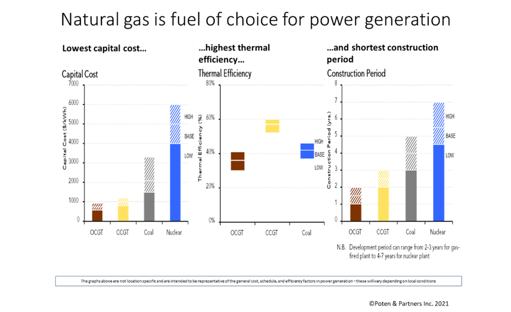 Natural gas has the highest hydrogen:carbon ratio of any hydrocarbon and hence to lowest CO2 emissions. A gas fired CCGT emits about half the CO2 of a coal fired power station for the same output and is around half the capital cost. Gas is also relatively safe to handle due to its modest explosive limits and low flame speed, plus rapid dispersion of leaks due to its low density.
