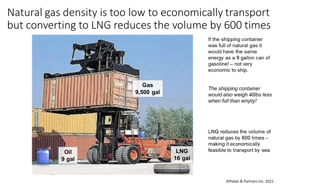 The problems with natural gas are its very low density (about one thousandth of oil) and a low triple point (it cannot keep it as a liquid at ambient temperatures). This means it is expensive to move by high pressure pipeline or as liquid natural gas (cryogenic temperatures – minus 160C).