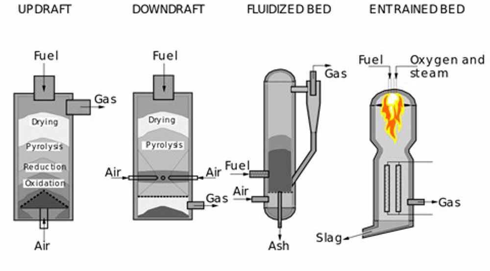 The advance of gasification has depended on the development of large, normally vertical reactors by Industry, to bring the fossil fuel, i.e., coal, coke, refinery heavy products and waste into close contact with the oxidants. Chemical engineers have developed high-pressure synthesis technology as exemplified by ammonia provided an incentive to look for methods to improve the efficiency of syngas production from coal. A variety of proprietary designs for entrained flow, fluidised bed gasification, and the use of oxygen/steam has been developed. The holders of these designs drive the commercial market.